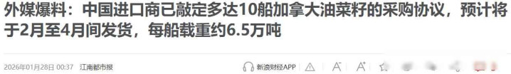 2026年1月27日,路透社发布消息说,中国一次订购了10艘油菜籽货船,总量达到65万吨,平均每艘装6.5万吨,这批货物从2月开始分批运输,一直持续到4月才结束,这个数量在过去几年中并不多见。加拿大农民近年处境艰难,自2023年起中美关系紧张,原来销往美国的农产品通道受阻,大量油菜籽积压在仓库里卖不出去,价格跌得厉害,有些农民连种子成本都收不回来。